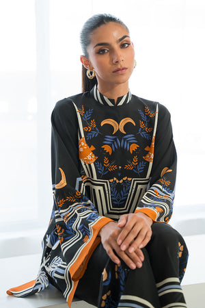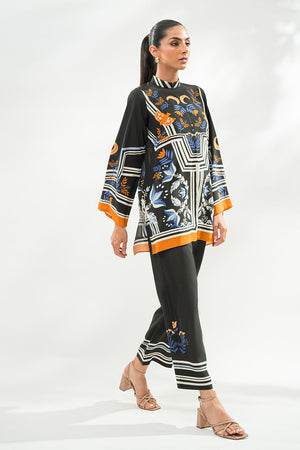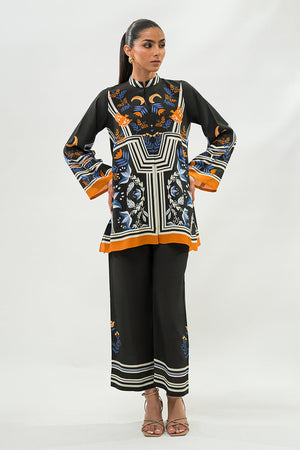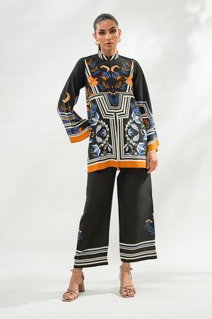 'A painterly printed charcoal hued crepe co-ord set featuring a shirt and culottes is printed with bold floral imagery.