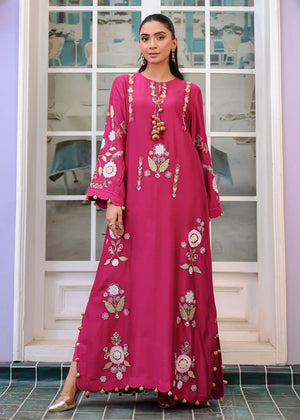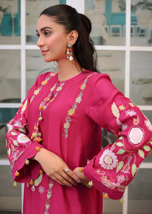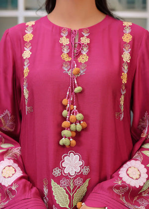 Description: This stunning mauve-pink hue embodies the essence of breezy summers, enhanced by exquisite appliqué details and vibrant floral embroidery. The elegant hangings elevate the overall design, making it a definitive statement of style.