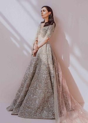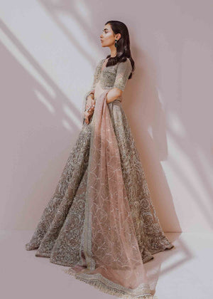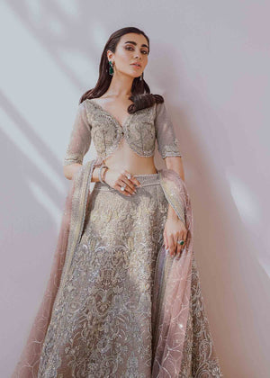 Description: Lehanga has hand work zardozi fused with uncut semi-precious stones and crystals, with tilla wasli flowers and Swarovski all over. Choli is encrusted with heavy zardozi in silver and gold fused with subcontinental wasli technique with sleeves fully hand worked with hand sewn cut Dana. With same zardozi, wasli border. Dupatta has all handwork or aari sequin pattern all over with crystal and zardozi borders on 4 sides.