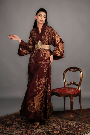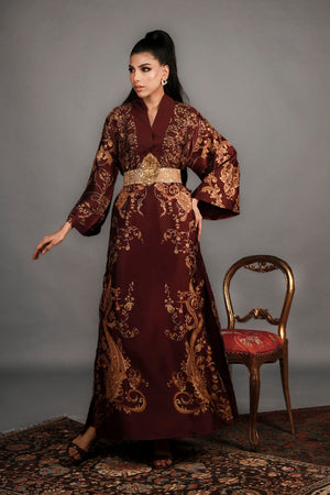 The Long Kaftan Style Shirt in Deep Maroon embrace elegance , featuring long side slits and coordinated pants in rich deep maroon. The Intricate paisley print, combined with baroque motif in antique tones, is beautifully enhanced with metallic thread outlines, adding a subtle regal richness to the garment. A statement belt in gold and sequins introduces glamour and bling, elevating the overall look.. This ensemble effortlessly blends sophistication with regal glamour, making it a perfect choice for any special occasion.
