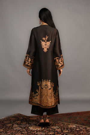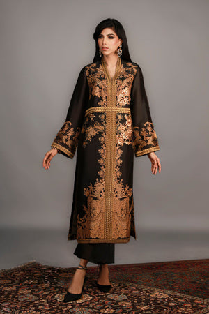 This exquisite three-piece set features a detailed printed black silk long shirt, complemented by a long ivory printed stole and sleek black silk pants. The subtle contrast between the pieces creates a striking yet refined look. Shamaeel’s meticulous attention to detail is evident in the hand embroidery and outlined prints in antique metallic shaded, floral embroidery motives enhancing the garment's timeless and old world appeal. Rich in silk and intricate embroidery, this ensemble is an ideal choice for the festive season, combining elegance and sophistication effortlessly.