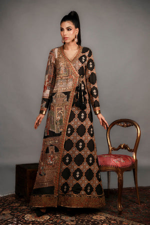 Experience the allure of Ottoman heritage with this exquisite anghrakha, featuring original Shamaeel miniature prints enhanced by intricate handwork and embellishments. This masterpiece captures the essence of the hierarchy of Ottoman queens, reflecting their grace and elegance. The geometric patterns outlined in metallic dull gold tones set this garment apart, adding a luxurious touch to the overall design. With rich embroidery textures and intricate details, this anghrakha is fully designed for formal events, making it a perfect choice for those seeking sophistication and style.