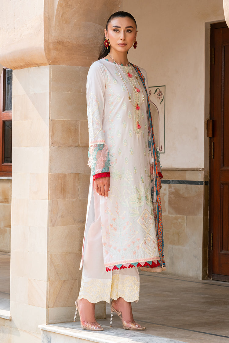Drenched in the ethereal hues of anglic white canvas get ready to be enchanted by the delicate embroidery that weaves an intricate delicate motif adorned with graceful florals and dainty patterns. As your eyes wander, a luscious, silk dupatta unfolds, showcasing an artistry of blooming flowers, playful festoons, and vivid hues. Encased within a geometric border, it exudes a vibrant festivity that enlivens the entire composition.
