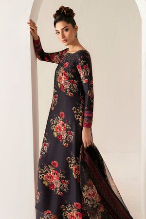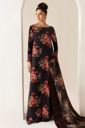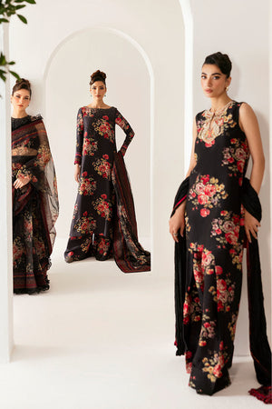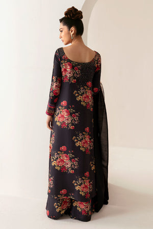 A black floral printed long shirt with sequined floral detailing creates a stunning fusion of elegance and glamour. Paired with floral printed pants, the ensemble offers a bold yet sophisticated look.