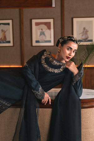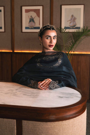 Immerse in elegance with our Nightfall ensemble. Crafted from pure cotton net, this midnight blue masterpiece features a long shirt adorned with multi-head floral garlands done with delicate pearl-like silken thread. The embroidery accents the boat neckline, sleeves, and hemline features embroidery in geometric patterned scrolls. It is paired with pure cotton net pants adorned with exquisite trims, Completing the look is a pure organza-based dupatta featuring minimal details, with the center part enhanced with lace and finished with dainty trims across all four sides for an elegant look.