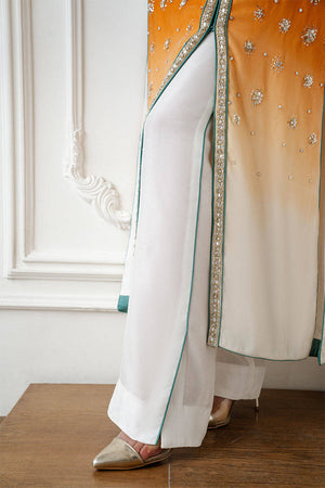 Twilight Ombré is a breathtaking jacket adorned with intricate hand embellishments throughout, featuring modern fitted sleeves that add a contemporary edge to its timeless allure. Paired with white flared pants, this ensemble strikes the perfect balance between sophistication and modern elegance.