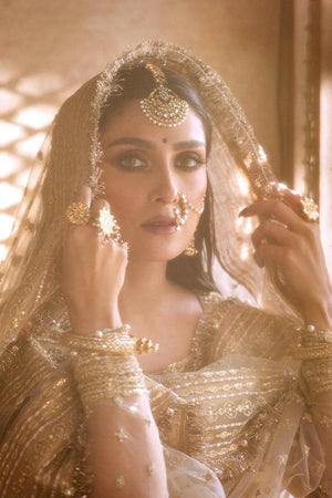 - Royalty is the second name of this outfit. Made with heavy embroidery and gotta work followed by beautiful set of sequins. Adorned with crystals and pearls making it a great fit for the festive season.