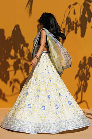 A striking ensemble pairs a midnight blue velvet choli with intricate zardoze and gota embellishment. The plush choli is balanced by the radiance of a pale cream hued lehnga, detailed with shimmering silver zardoze and gota embroidery and touches of periwinkle and lime florals that create cascading botanical latticework that finishes in a richly worked border. A pre draped organza dupatta completes the look, elevated with gota work and delicate edging, and a jeweled peacock brooch adds a refined touch to the waistband of the lehnga for a polished silhouette.