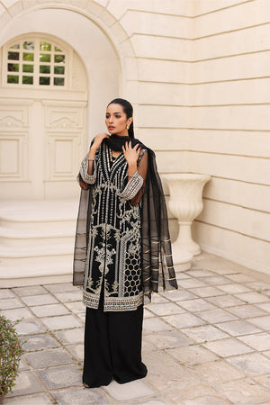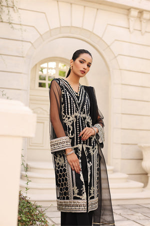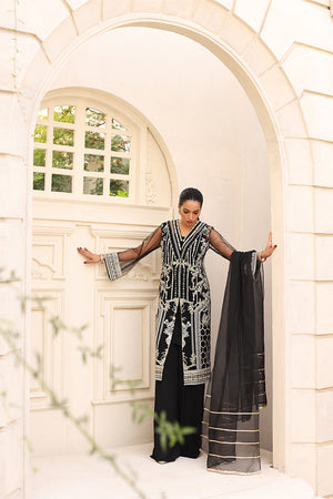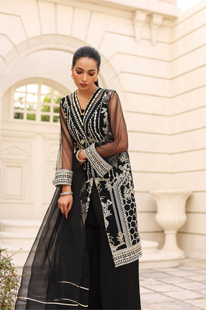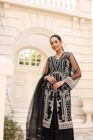 Stand a part in a perfect balance in this embroidered black dress paired with black raw silk pants & organza dupatta.