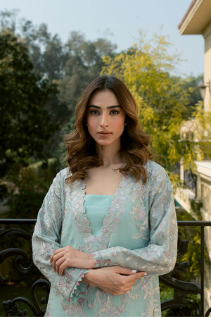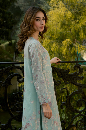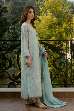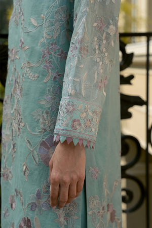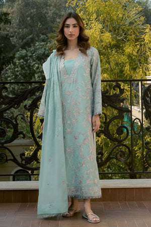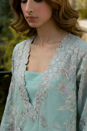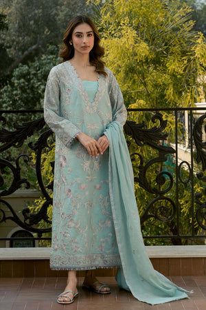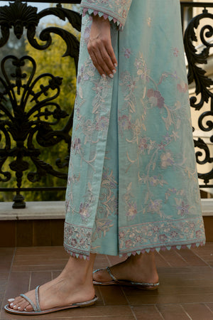 Introducing 'Uran', a breathtaking ensemble inspired by exquisite chinoiserie florals. Set against a serene sky blue canvas, this masterpiece features intricately detailed embroidery in multi-hued borders, paired with a matching embroidered dupatta and culottes. Perfect for making a stylish statement at your summer soirees.