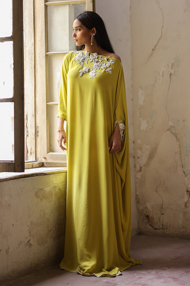 This limelight free fall georgette kaftan is stare worthy. The hues of ivory resham, sequin and bead work are placed carefully forming a soothing eye movement on side pocket, front, back and sleeves.