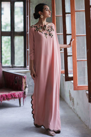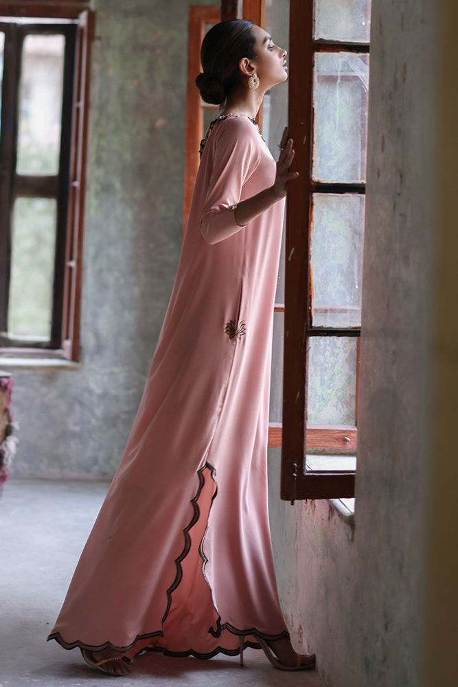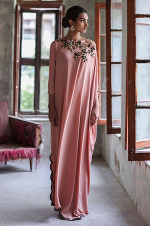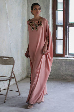 This Nude pink free fall georgette kaftan is stare worthy. The hues of ivory resham, sequin and bead work are placed carefully forming a soothing eye movement on side pocket, front, back and sleeves.