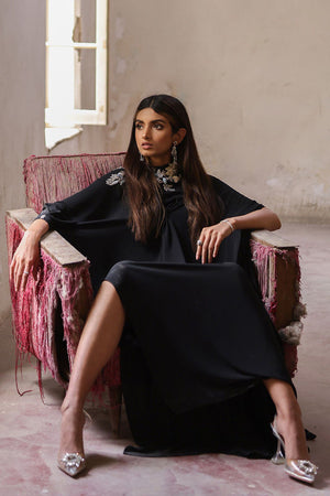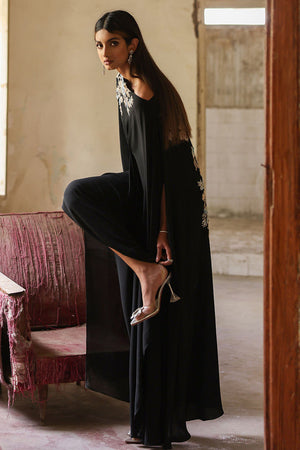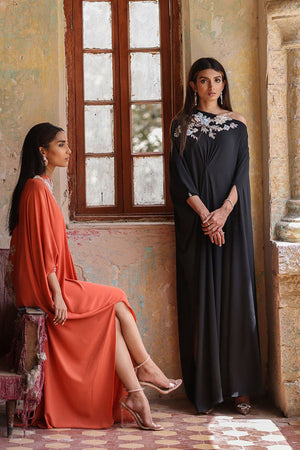 A beauteous free fall georgette off shoulder black kaftan in pleated style stands out in the crowd. The exquisite embellishments around the front neckline and all over the back comprises of 3d resham florals embroidery, pearls, cutdana and chunky crystals is worth buying.