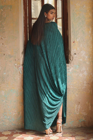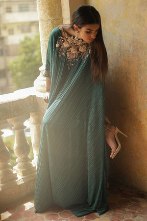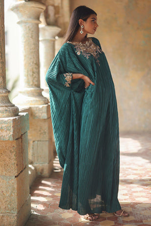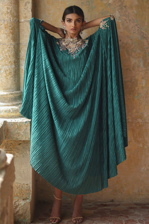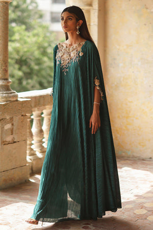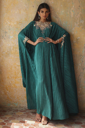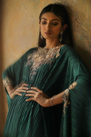 A stunning emerald green pleated kaftan gives major fashionista goal. The 3d jewel look embroidery around the neckline is a real beauty.