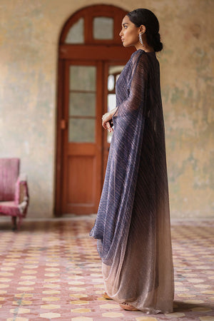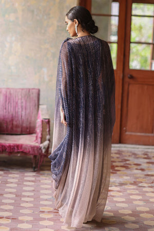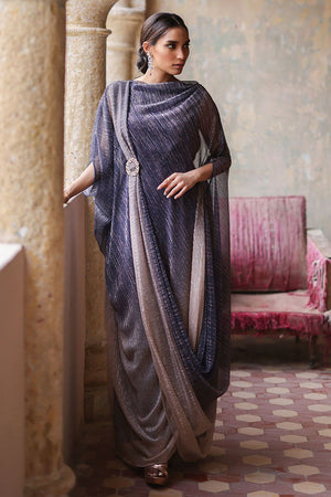 A pictographic resemblance of the Greek goddess is seen in this navy blue and nude ombre shimmery kaftan. The cowls are draped towards the hem creating a soothing eye movement. The look of the outfit is enhanced with a crystal buckle.