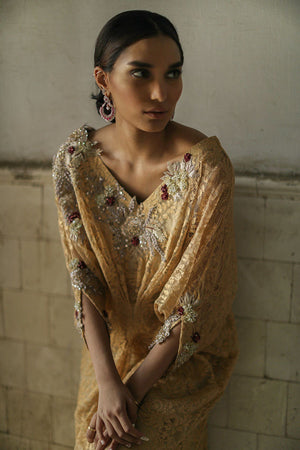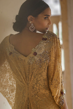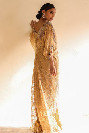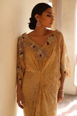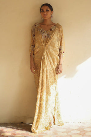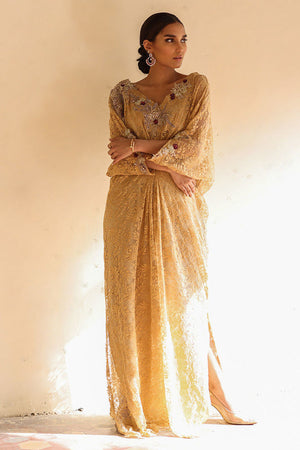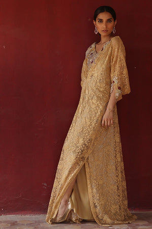 A perfect fusion of modern and traditional heritage can be witnessed in this gold Chantilly kaftan. The front and back neckline and sleeves are highlighted with crafted motifs of resham, zari, crystals, sequins and diamantes.