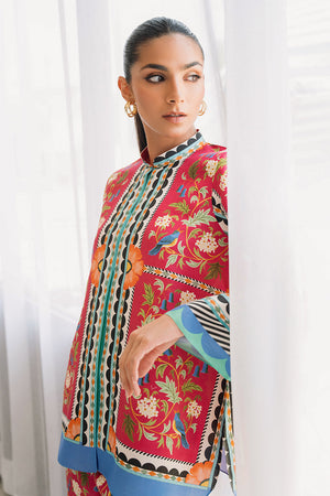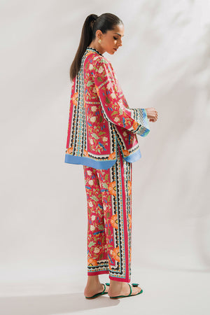 'A quintessential print composed of florals and birds takes centre stage in this bubblegum pink rawsilk co-ord set.