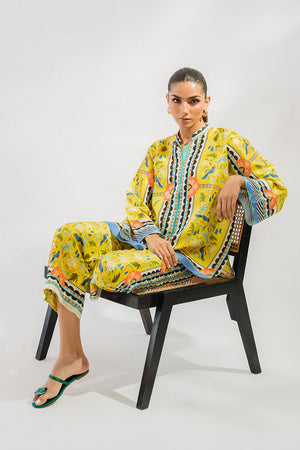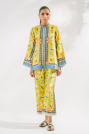'A quintessential print composed of florals and birds takes centre stage in this vibrant yellow rawsilk co-ord set.
