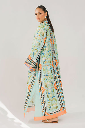 A quintessential print composed of florals and birds takes center stage in this mint green raw silk kaftan.