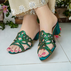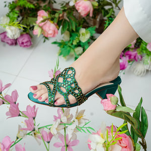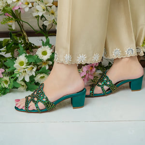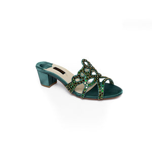 Our signature 'Valentina', is now in a luxurious green satin. The delicate scallops are adorned with crystal stones to create a more formal look. Look no further for a versatile wardrobe hero. This block heel allows ease of wear while shining bright.