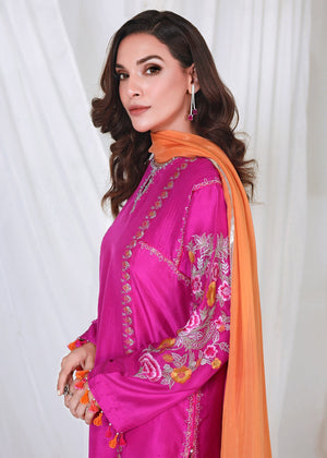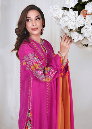 Introducing Vanya from the Misha Collection '24 by Reema Ahsan Bridal Lounge. This luxurious 3-piece ensemble in magenta pink is designed to exude elegance and sophistication. Crafted from premium pure raw silk, the set includes an embroidered long shirt, matching pants, and a beautifully adorned two-tone silk dupatta with gotta finishing. Perfect for those who seek high-end luxury clothing for special occasions.