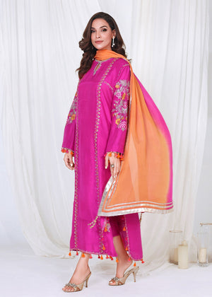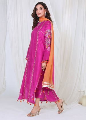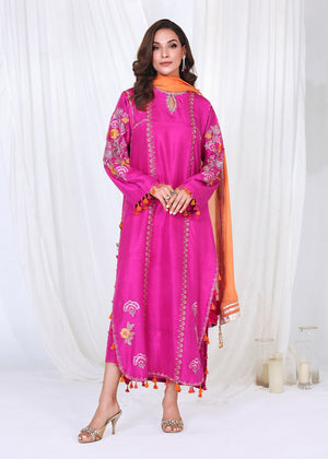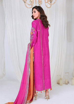 Step into a world of luxury with Vanya, a stunning magenta pink outfit from the Misha Collection '24. This 3-piece set includes an embroidered long shirt made from pure raw silk, matching pants, and a two-tone silk dupatta adorned with intricate gotta finishing. The celestial embroidery and pleating details on the pure raw silk fabric elevate this ensemble to new heights of sophistication and style.