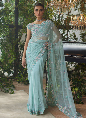 A breathtakingly beautiful saree that draws you in with its exquisitely intricate embroidery. On a canvas of dreamy aqua tulle, 3-D flowers bloom delicately amongst soothing green canvas, as bedazzled butterflies float in between.Subtly shimmering sequins encrusted on the entirety of the saree add to the truly ethereal look.