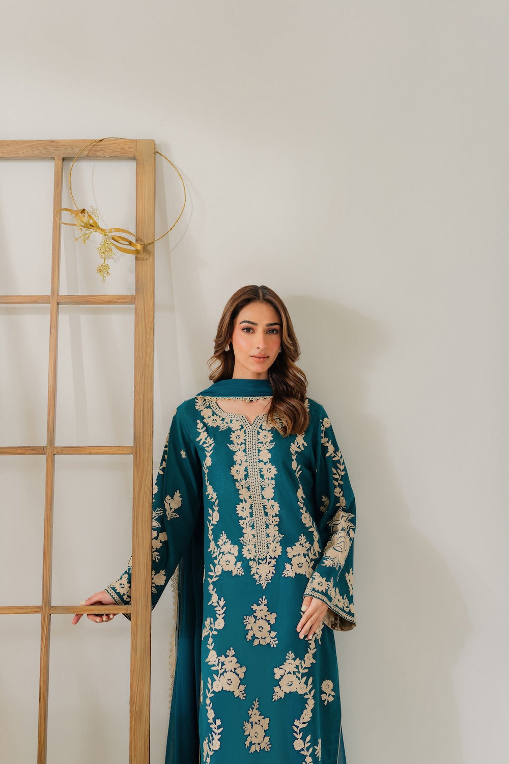 This elegant teal two-piece features delicate hand aari embroidery intricately spread all over the shirt, adding refined texture and charm. The rich fabric and detailed craftsmanship make it ideal for all your occasions. A coordinating dupatta is available separately to complete the ensemble.