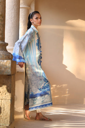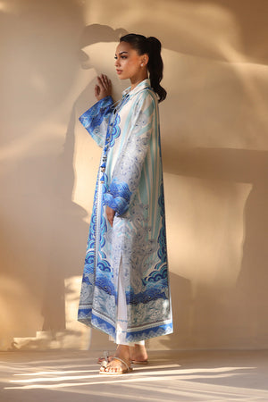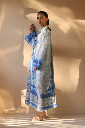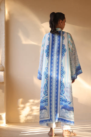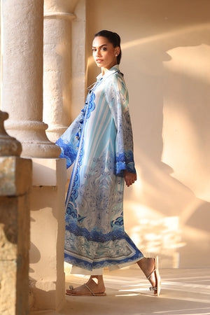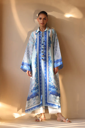 A fluid, flowing silhouette is adorned with a swirling print in a serene fusion of cerulean and ivory hue. The billowing pure rawsilk shirt accented with delicate tassels tying the collared neckline, exudes effortless elegance. Expertly tailored ivory hued pure rawsilk culottes with cerulean scallop details complete the look.