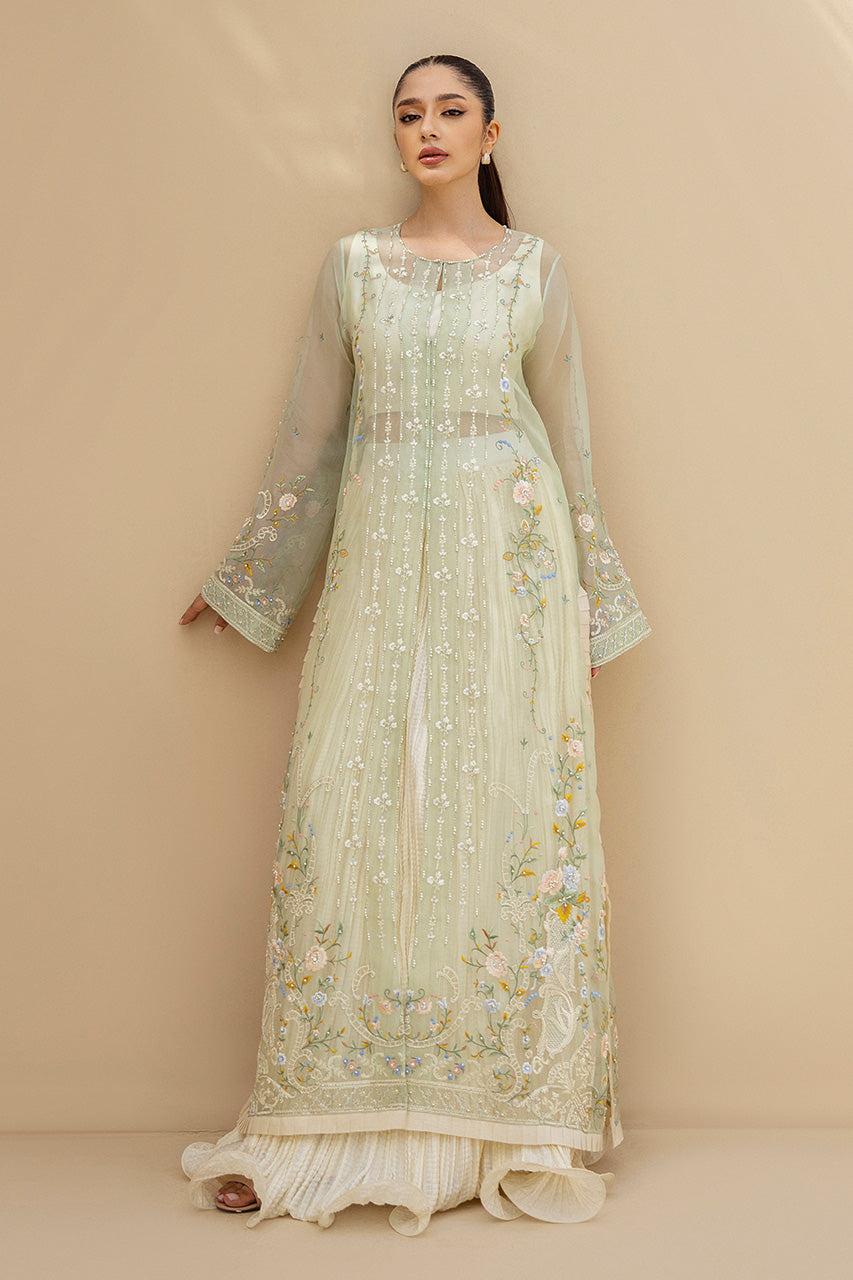 Awash in muted mint tones, a sheer front open shirt is detailed with floral threadwork, sequin accents, and handcrafted tassels that cascade down the front. Paired with a pleated crushed skirt that falls in graceful swirls, it becomes an ethereal statement.