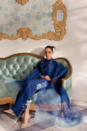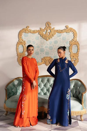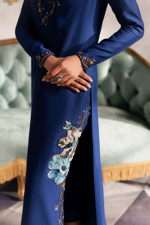 This stunning ensemble features a dark navy blue hue, exuding sophistication and timeless elegance. The outfit is designed with a modern, sleek cut, offering a flattering silhouette that balances contemporary style with classic charm. The long shirt, cut in a flattering bustier style, is intricately embellished with delicate embroidery and subtle embellishments, adding depth and texture to the look. The embroidery, featuring delicate patterns, gracefully accents the bodice, while the embellishments catch the light, creating a sense of understated luxury. Paired with straight-leg pants that offer a relaxed yet refined fit, this outfit exudes effortless grace and a confident, polished aesthetic. Perfect for evening affairs or upscale gatherings, it combines both modernity and tradition in one stunning package.