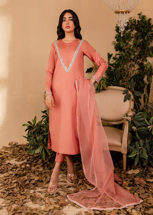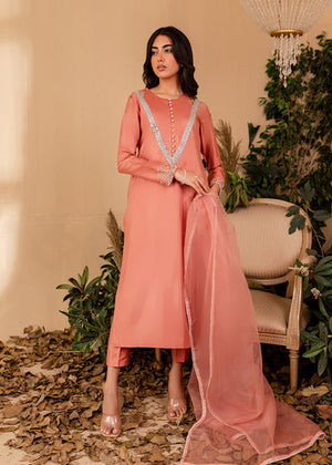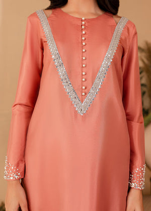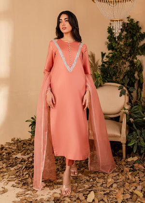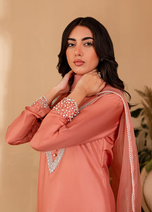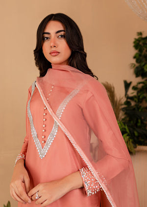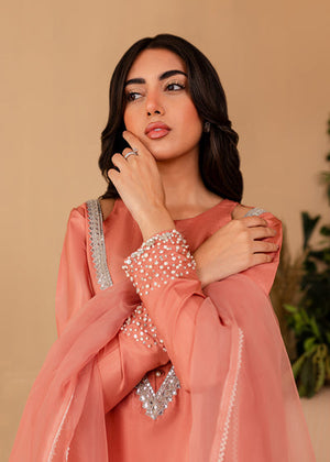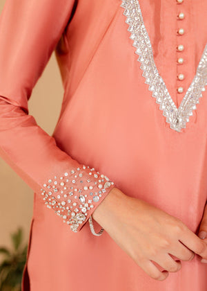 The softest hue of pink becomes the base for Vera. The outfit features a stunning shirt with Pearl and hand picked stones paired with a chic pair of bottoms. Comes with a beautiful sheer dupatta with pearl borders. An extraordinary look for an extraordinary woman.