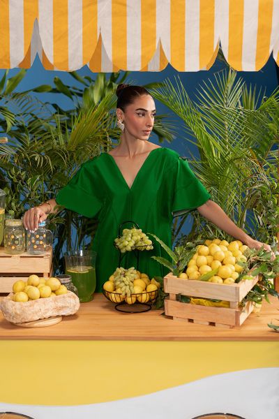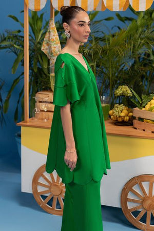 This sophisticated outfit in rich bottle green exudes refined elegance with a modern touch. The short shirt is designed in structured panels, each carefully stitched to enhance the silhouette and create a subtle play of texture. Delicate piping runs along the panel lines and edges, adding definition and a polished finish to the overall look. The neckline is veiled, softly draped or layered to offer a graceful and slightly mysterious charm. Paired with sleek bootcut pants, the ensemble maintains a perfect balance between tailored structure and flowing movement. Understated yet detailed, this outfit is ideal for those who appreciate thoughtful craftsmanship and contemporary styling in deep, regal tones.
