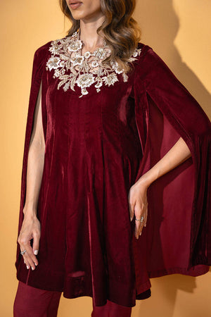 An exquisite deep red velvet cape featuring heavy embellishments around the neckline with swroskis and hand work, making it a true statement piece. It is elegantly paired with matching raw silk straight pants, creating a cohesive and sophisticated look that exudes glamour and confidence.