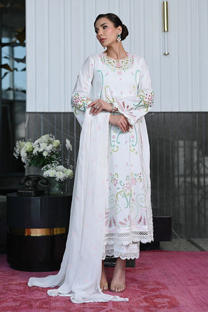 An exquisite white long shirt, delicately adorned with hints of green and pink and featuring intricate Schiffli work throughout. The graceful lace borders and bell sleeves add a touch of elegance, while the silk dupatta, paired with a silk suit and Izaar pants with lace detailing, complete this refined ensemble.