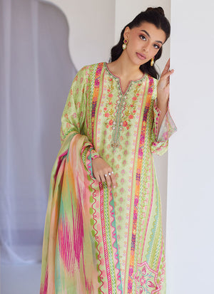 The gorgeous, digitally printed, pure medium silk dupatta in uplifting green, pink and coral tones completes your ensemble.