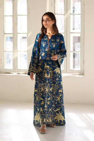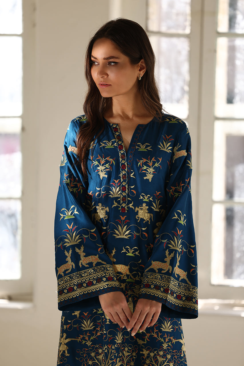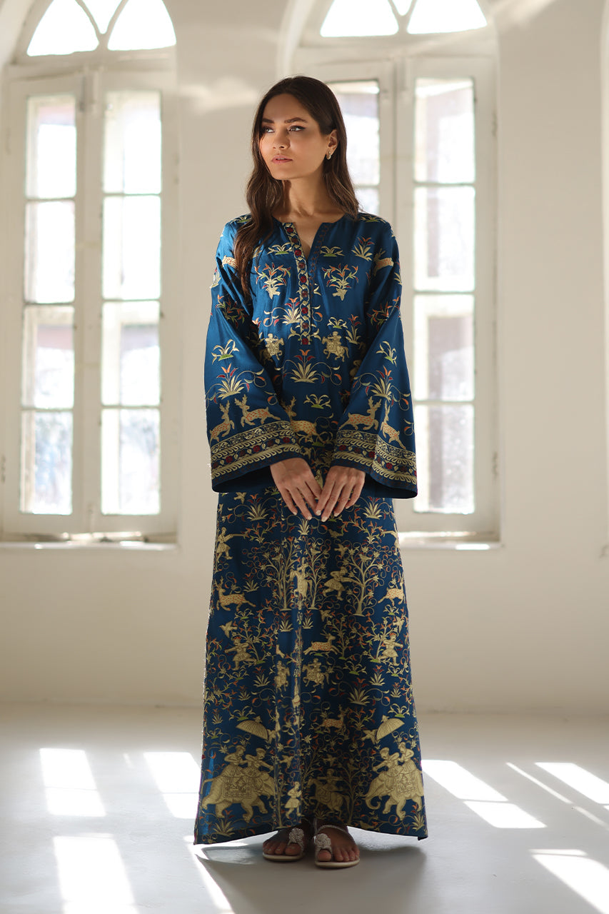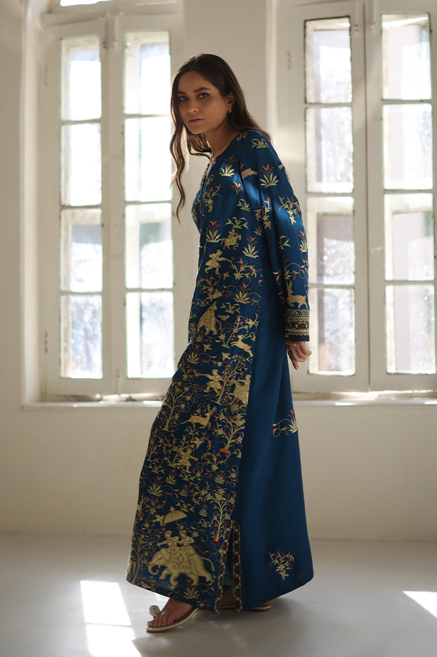 Cloaked in a deep teal hue, this pure rawsilk kaftan exudes regal charm with an exquisitely embroidered tapestry of flora and fauna, accented by Mughal inspired appliqué details. The fluid drape evokes timeless grandeur, while a delicately embroidered border elevates the neckline and sleeves. Paired with pure rawsilk trousers in a matching shade, the ensemble is a portrait of refined opulence.