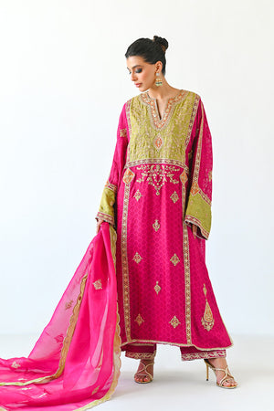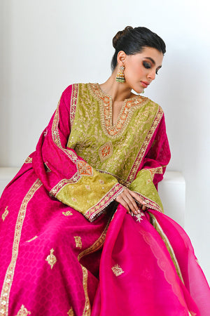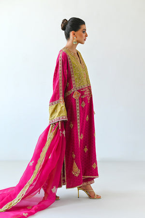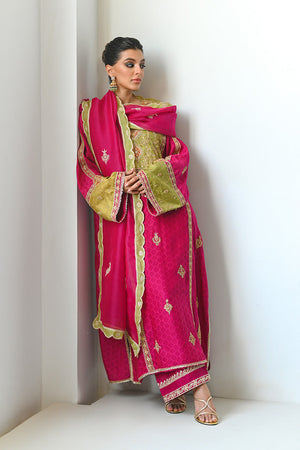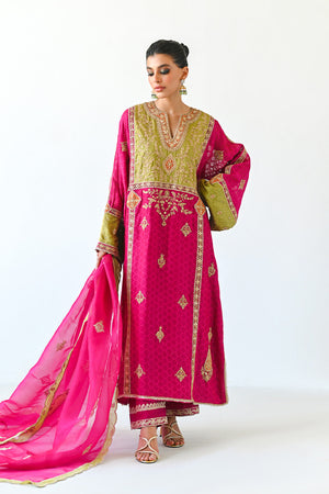 A timeless fuchsia hued long kurta becomes an heirloom piece with its meticulous marori embroidery. The brocade dual-toned appliqué neckline, in subdued pistachio and tangerine hues, creates a striking contrast against the monochrome ensemble. The appliqué details, paired with intricate marori work extend gracefully onto the relaxed sleeves. A matching organza dupatta adds a classic touch with its marori embroidery and scalloped pistachio-toned border. The ensemble is completed with pure raw silk izaar, featuring an elegantly embroidered hem.