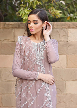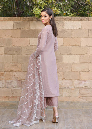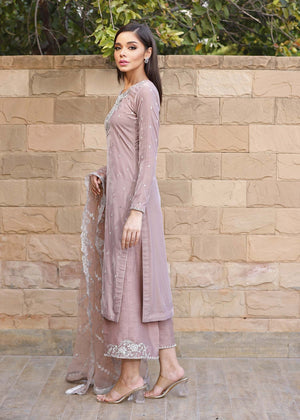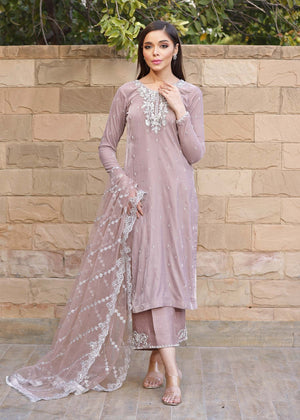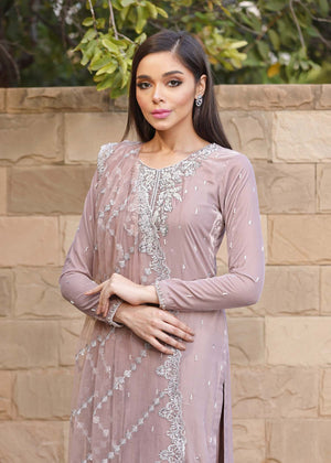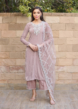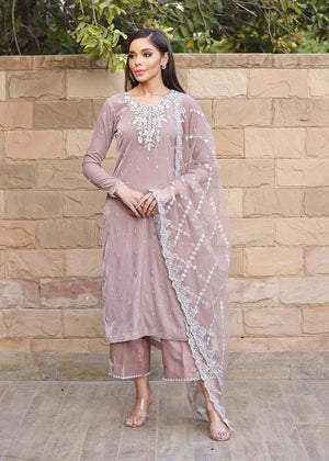 This season's must-have color for winter festivities that will make you stand out at any special occasion is a dusty pink hue, perfect for flattering any silhouette. Our velvet dress, crafted in this chic shade, is a timeless choice that will never go out of style. The dress is embellished with intricate silver details on the neckline and fully hand-sprayed sleeves and front , making it the perfect choice for an unforgettable wedding look. The net dupatta, decorated with shimmering silver sequins, completes the ensemble with effortless elegance. This outfit is a must-have for anyone looking to make a statement at their next special occasion.