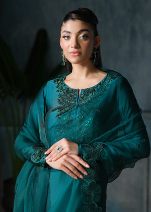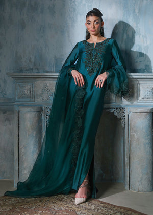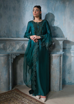 This classic emerald green silk tissue long kaftan shirt is a true statement piece, featuring exquisite embellishments of green nakshi, sequins, gota, and cut dana along the neckline. The sleeves are adorned with an elegant embellished border at the hem, adding to its charm. Paired with a flowy organza dupatta featuring delicate chun and a stunning floral pallu, this ensemble beautifully balances tradition and modern elegance, making it perfect for any festive occasion or special gathering.