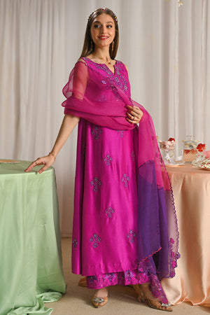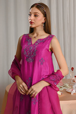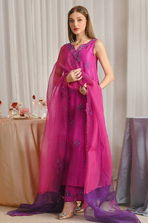 This Vivia outfit features a luxurious pure raw silk magenta sleeveless shirt with a cutwork neckline. The organza dupatta is detailed with intricate appliqué, while the izaar is beautifully adorned with appliqué and embroidery.