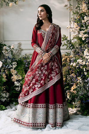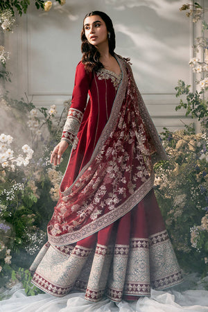 An elegant maroon raw silk kalidar featuring an intricately detailed hand-embellished neckline and beautifully fitted sleeves, accented with exquisite borders at the cuffs and hem. The ensemble is elevated by a heavily embroidered draped dupatta, adding a modern touch, and is completed with same color sharara pants for a cohesive and sophisticated look.