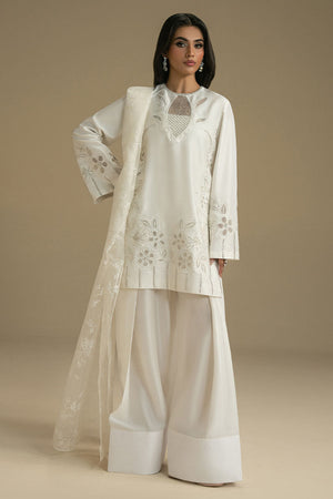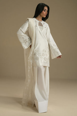 A vision in white, this ensemble speaks the language of quiet sophistication. The short shirt, tailored with sharp modernity, is adorned with intricate tone-on-tone embroidery that creates texture without overpowering the purity of the palette. A subtly embellished neckline adds just the right touch of refinement, catching the light with understated elegance. Paired with a flowing farshi shalwar, the silhouette balances tradition with a contemporary edge.Completing the look is a screen-printed organza dupatta, airy yet detailed, adding depth and dimension to the monochrome canvas. Minimalist yet intricate, this outfit is designed for those who appreciate grace in restraint