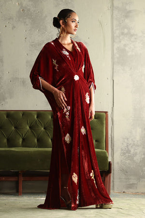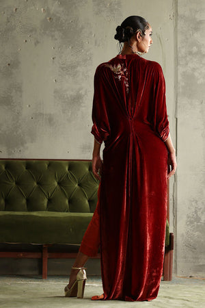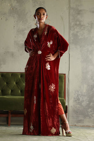 Introducing our stunning Burnt Orange Pleated Kaftan, crafted from luxurious pure velvet for a rich and sophisticated look. With a length of 58 inches, this kaftan features exquisite front and back embroidery in vibrant coloured resham, accented with silver and gold zari and lorex zari for a touch of glamour. The intricate handwork includes sparkling stones, sequins, and cutdana, adding layers of texture and elegance. This kaftan is perfect for special occasions or evening events, ensuring you make a bold statement wherever you go. Embrace the allure of this one-of-a-kind piece that beautifully combines tradition with modern style!