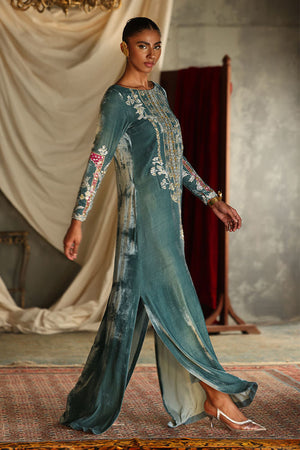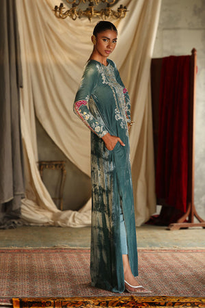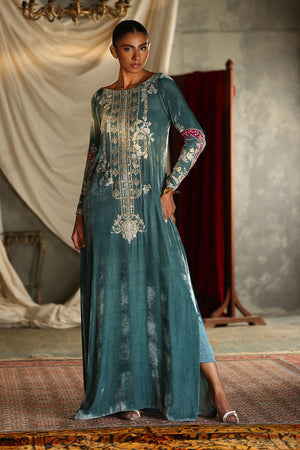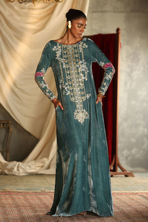 Step into elegance with our striking Wasabi Green Straight Kaftan, crafted from pure velvet for a luxurious touch. This beautiful kaftan features a length of 58 inches, designed to flatter your silhouette effortlessly. The long neckline and sleeves are intricately embellished with a stunning array of silver and gold details, including resham, zari, kora, dabka, naqshi, sequins, gota, moti, cutdana, tikki stones, and pearls, creating a truly opulent look. Perfect for special occasions or formal gatherings, this kaftan is a versatile addition to your wardrobe that radiates sophistication and style. Embrace the artistry and charm of this captivating piece!