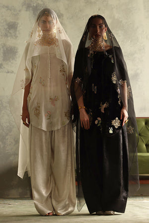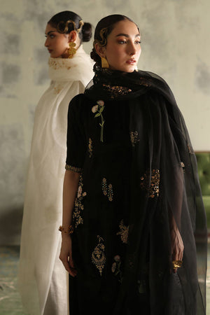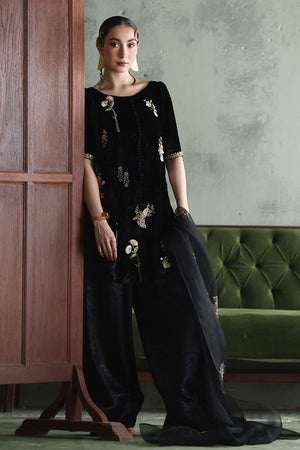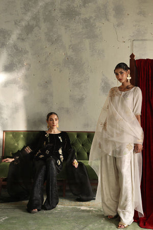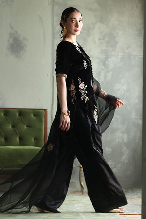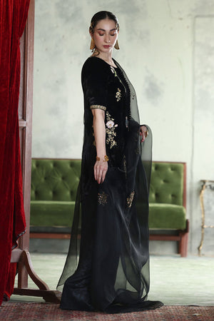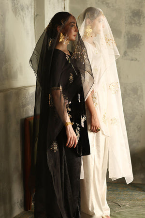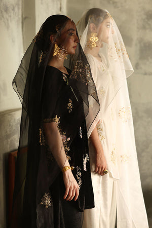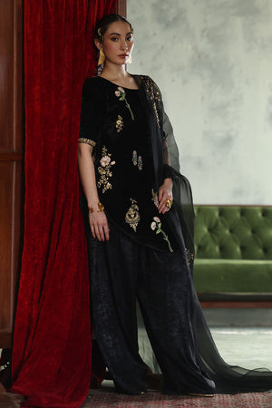 This elegant ensemble in classic black is crafted to captivate. The short shirt, is made from pure velvet with a length of 33 inches, adorned with intricate zari bunches in colored Resham, zardozi, sequins, cutdana, tikki stones, and naqshi, creating a beautifully textured design. Paired with a 42-inch shimmer crepe shalwar, this outfit achieves a balance of tradition and modern flair. Completing the look is a pure organza dupatta, embellished with delicate handwork, adding a light, ethereal touch to this luxurious set.
