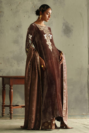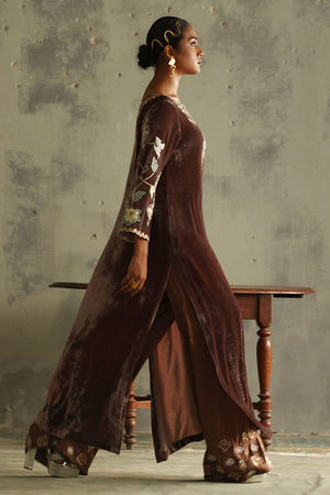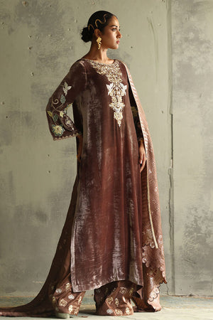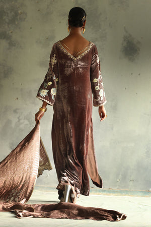 This exquisite taupe slight A-line shirt is made from pure velvet with a 50-inch length. The front neck is beautifully embroidered in silver, gold, and rose gold zari, featuring intricate handwork with tikki stones, kora, dapka, moti, nakshi, sequins, cutdana, and gota. The back neck continues this detailed handwork, while the sleeves are enhanced with colored sheesha silk appliqué and gold, silver, and rose gold zari embroidery. Paired with satin crepe culottes with zari embroidery at the bottom and a 42-inch length, the look is completed with a pure Banarsi dupatta, finished with elegant laces, offering a blend of modern sophistication and traditional opulence.