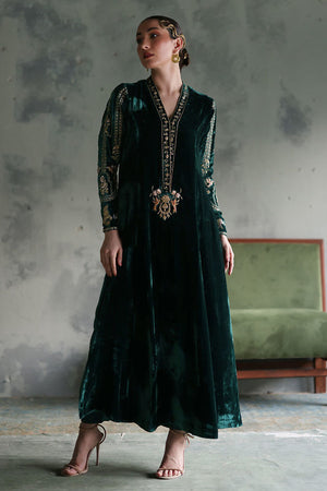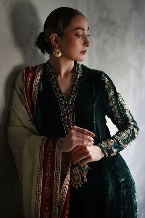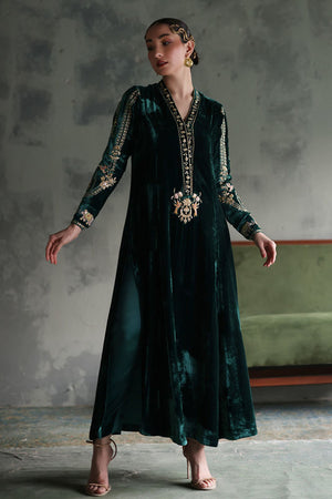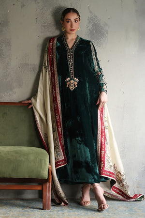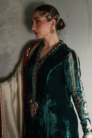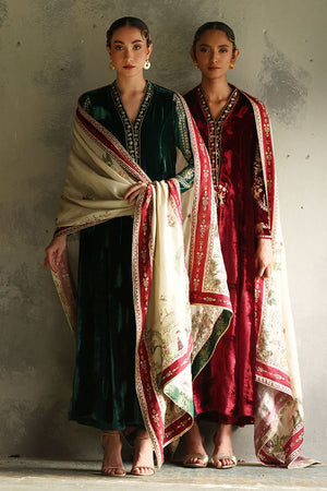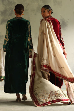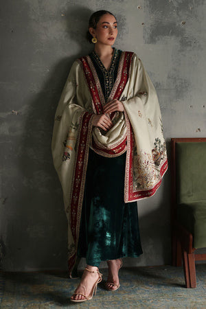 This elegant evergreen prince panel shirt, is crafted from pure velvet with a 52-inch length. It features intricate gold and antique zari embroidery, complemented by exquisite handwork of cutdana, tikki stones, sequins, kora, dabka, and naqshi, creating a rich, textured design. Paired with 36-inch pants in texture silk, the ensemble is both refined and contemporary. Completing the look is a luxurious Shisha silk shawl, adorned with intricate handwork of zardozi, gota, dhanak, and sequence flowers, adding a touch of opulence and sophistication to this stunning set.