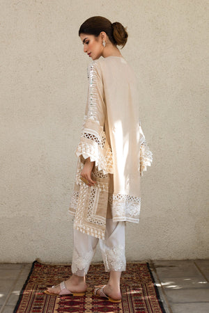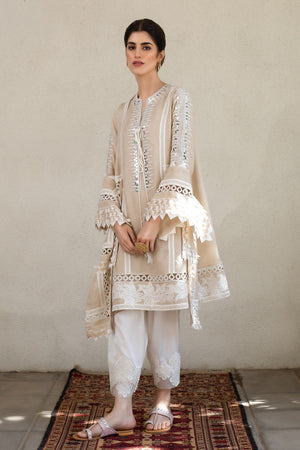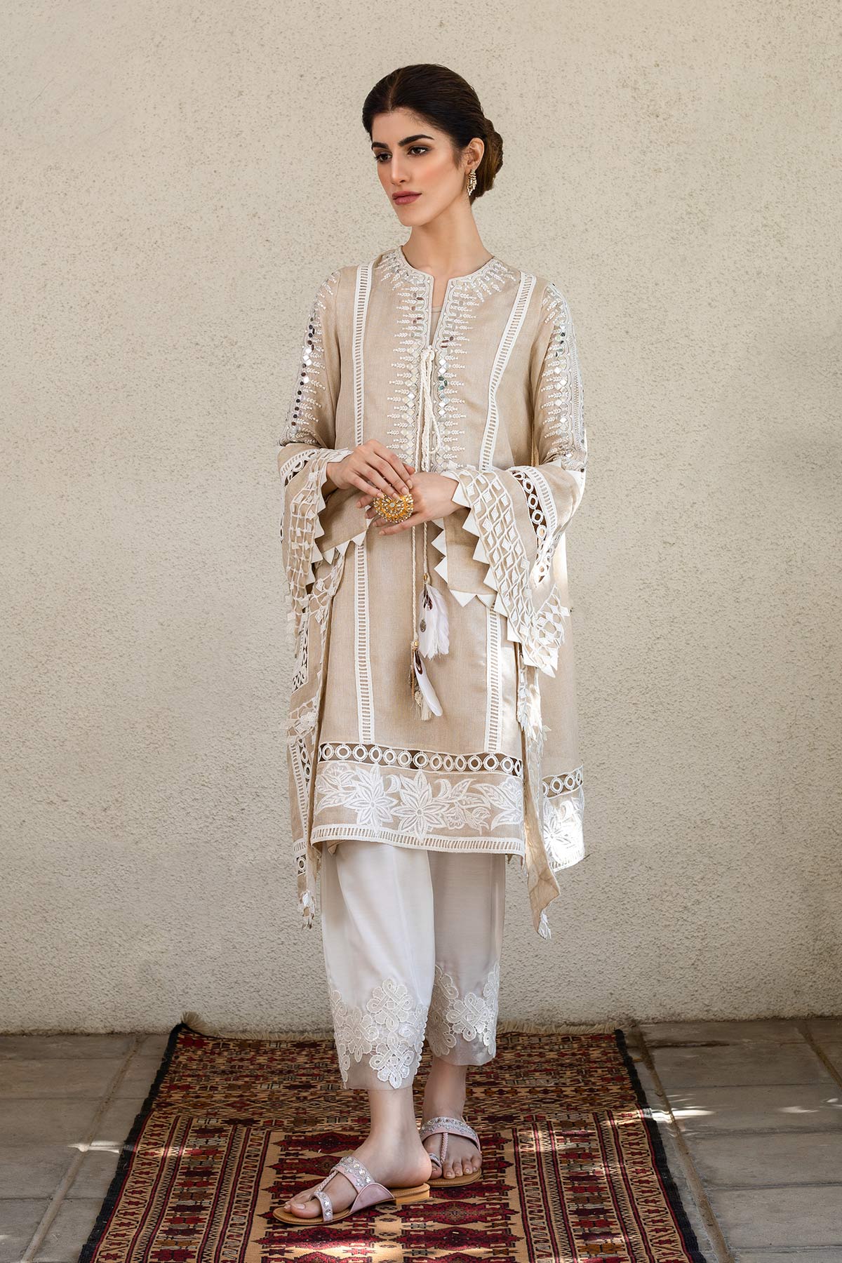 Embroided asymmetric silk blend jute net kurta. Neckline and sleeves finely embroided with a silk thread and mirror work.Color: Gold Beige