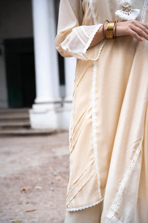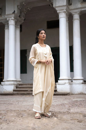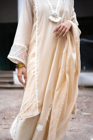 Off white Khadi cotton net shirt, detailed with laces, pleats on the sides and organza sleeves with handmade tassel. Paired with matching culottes with organza and detailed laced dupatta.